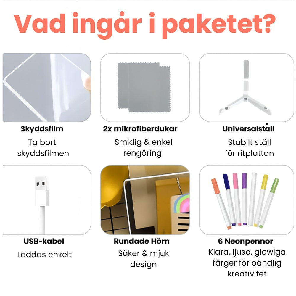 MagiBoard™ förvandlar vardagsritandet till magi. Barn får uttrycka sin fantasi utan papper eller färg som kladdar. Den återanvändbara, USB-laddade brädan skapar lugna, kreativa stunder hemma, på resan, vid läggdags eller när barnen annars gärna sitter med skärm – Med MagiBoard får idéer verkligen får lysa.